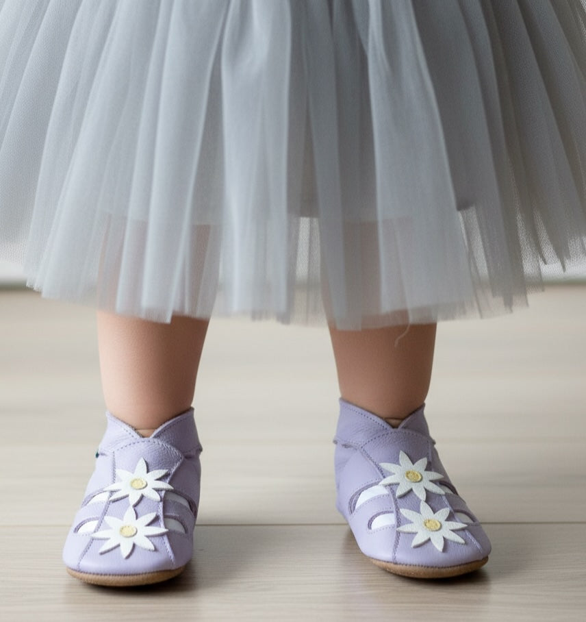 DP27, Flower Sandal Lilac Inch Blue %100 Hakiki Deri, El Yapımı Bebek Çocuk Patik