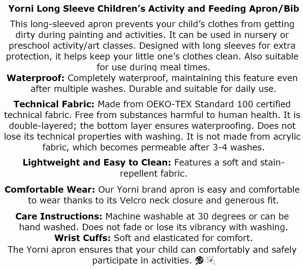 🖍️ Yorni önlük, minik sanatçıların hem rahat hem de temiz kalmasını sağlar.