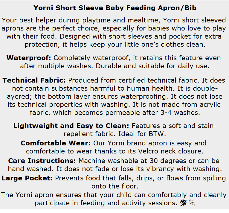 Oyun ve yemek zamanlarında en büyük yardımcınız! Yiyeceklerle oynamayı seven minikler için tasarlanan Yorni kısa kollu önlük, hem sıvı geçirmez hem de makinede yıkanabilir özel teknik kumaşıyla çocuğunuzun kıyafetlerini korur.