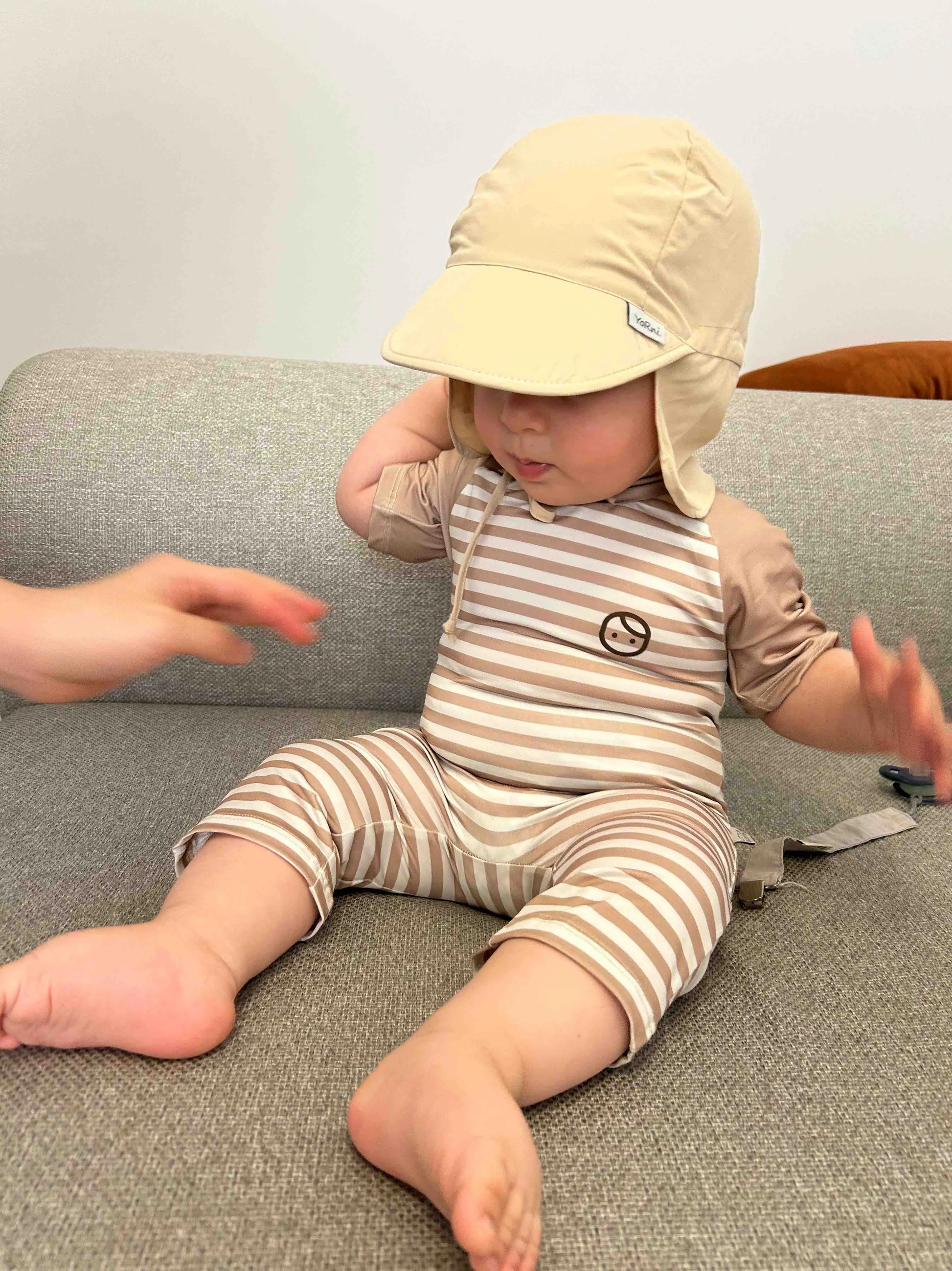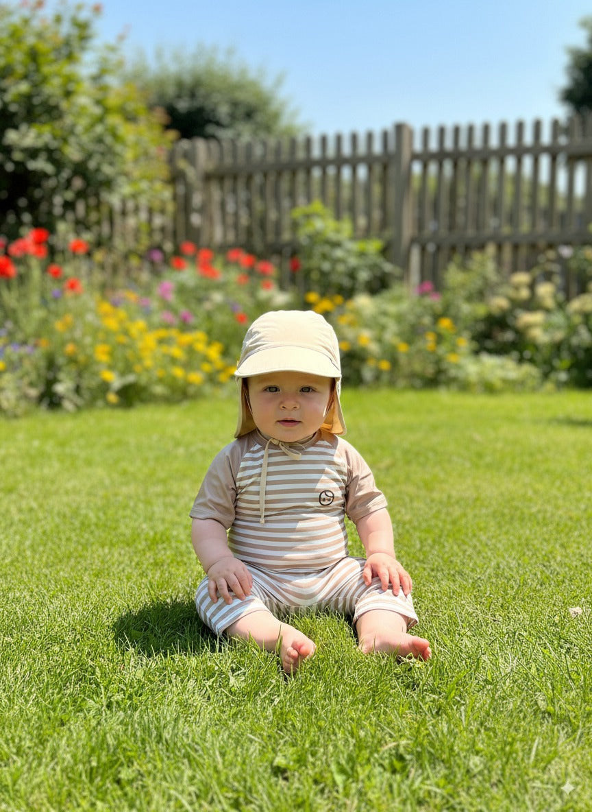 Haki (Bej), Ense Korumalı, Boyundan Bağlamalı, Arkası Ayar Tokalı, Astarlı Çocuk Bebek Güneş Şapka