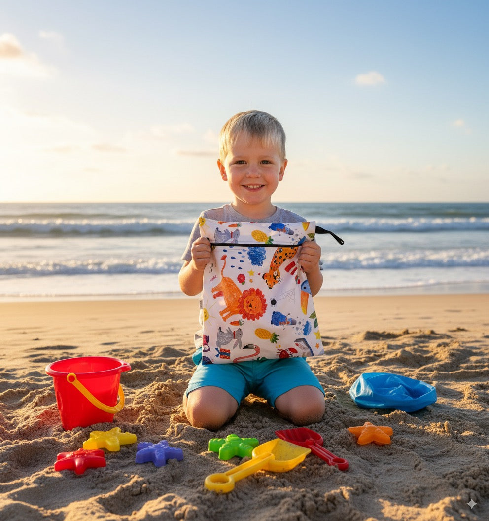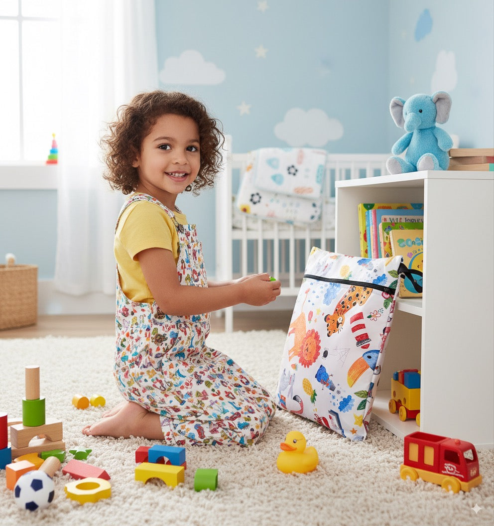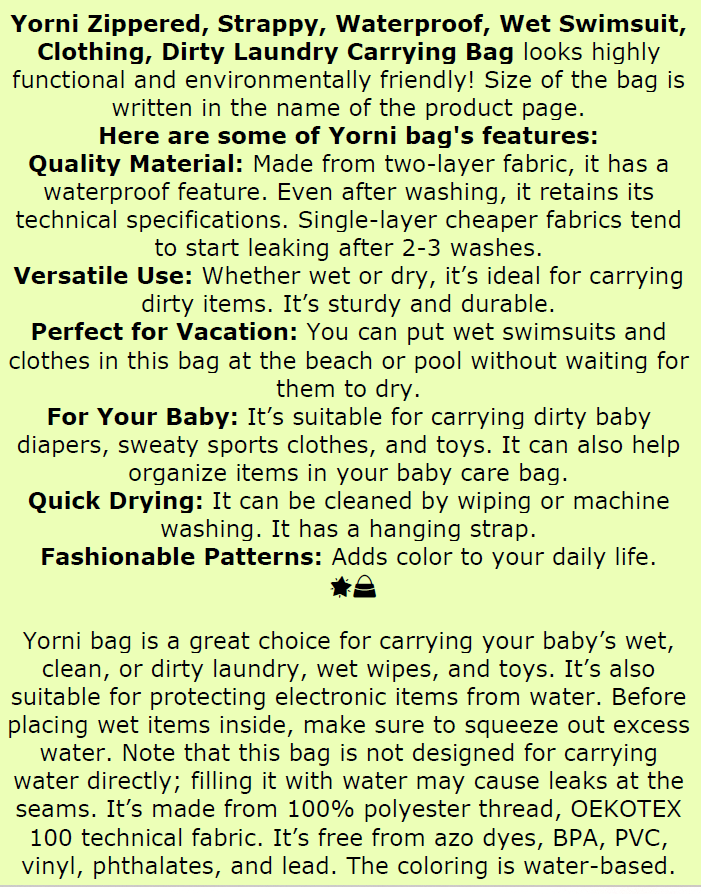 "Fermuarlı, Askılı, Su Geçirmez, Islak Mayo, Kıyafet, Kirli Bez Taşıma Çantası" Kaliteli Malzeme: İki katlı kumaş, sıvı geçirmez özelliğe sahiptir.; Yıkandıkça teknik özelliklerini kaybetmez.; Tek katlı daha ucuz kumaşlar 2-3 yıkamadan sonra su geçirmeye başlar.; Çok Amaçlı Kullanım: İster ıslak isterseniz kuru ve kirli eşyaları taşımak için idealdir.; Sağlam ve dayanıklıdır.; Tatil İçin Harika: Plajda veya havuzda ıslak mayo ve kıyafetlerin kurumasını beklemeden bu çantaya koyup eve gidebilirsiniz.; Bebeğiniz İçin: Kirli bebek bezi, kirli/terli spor kıyafetleri, oyuncaklar, makyaj malzemeleri ve elektronik ürünler için de kullanılabilir.; Hızlı Kuruma: Silerek veya makinada yıkanarak temizlenir.; Asmak için askısı vardır.; Moda Desenleri: Günlük yaşamınıza renk katar.; Bu ürün, bebeğinizin ıslak, temiz veya kirli çamaşırlarını, ıslak mendilini, oyuncaklarını taşımak için harika bir seçenektir.; Ayrıca bebek bakım çantası içinde eşyaları sınıflandırmak için de kullanılabilir.; Su ile temas etmesini istemediğiniz, oyuncak, makyaj malzemesi ve elektronik ürünler için de uygundur.; %100 Polyester iplikle dokunmuş, OEKOTEKS 100 teknik kumaş.; Azo-Boyar madde, bpa, pvc, vinyl, phthalate, kurşun içermez.; Su bazlı boyalıdır.; " *** "Yorni Zippered, Strappy, Waterproof, Wet Swimsuit, Clothing, Dirty Laundry Carrying Bag looks highly functional and environmentally friendly! Size of the bag is written in the name of the product page.; Here are some of Yorni bag's features: Quality Material: Made from two-layer fabric, it has a waterproof feature.; Even after washing, it retains its technical specifications.; Single-layer cheaper fabrics tend to start leaking after 2-3 washes.; Versatile Use: Whether wet or dry, it’s ideal for carrying dirty items.; It’s sturdy and durable.; Perfect for Vacation: You can put wet swimsuits and clothes in this bag at the beach or pool without waiting for them to dry.; For Your Baby: It’s suitable for carrying dirty baby diapers, sweaty sports clothes, and toys.; It can also help organize items in your baby care bag.; Quick Drying: It can be cleaned by wiping or machine washing.; It has a hanging strap.; Fashionable Patterns: Adds color to your daily life.; 🌟👜" Yorni bag is a great choice for carrying your baby’s wet, clean, or dirty laundry, wet wipes, and toys.; It’s also suitable for protecting electronic items from water.; Before placing wet items inside, make sure to squeeze out excess water.; Note that this bag is not designed for carrying water directly; filling it with water may cause leaks at the seams.; It’s made from 100% polyester thread, OEKOTEX 100 technical fabric.; It’s free from azo dyes, BPA, PVC, vinyl, phthalates, and lead.; The coloring is water-based