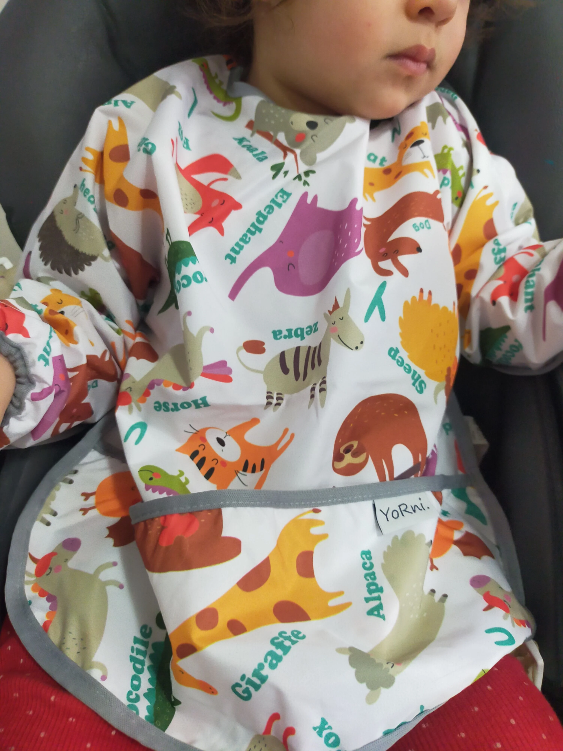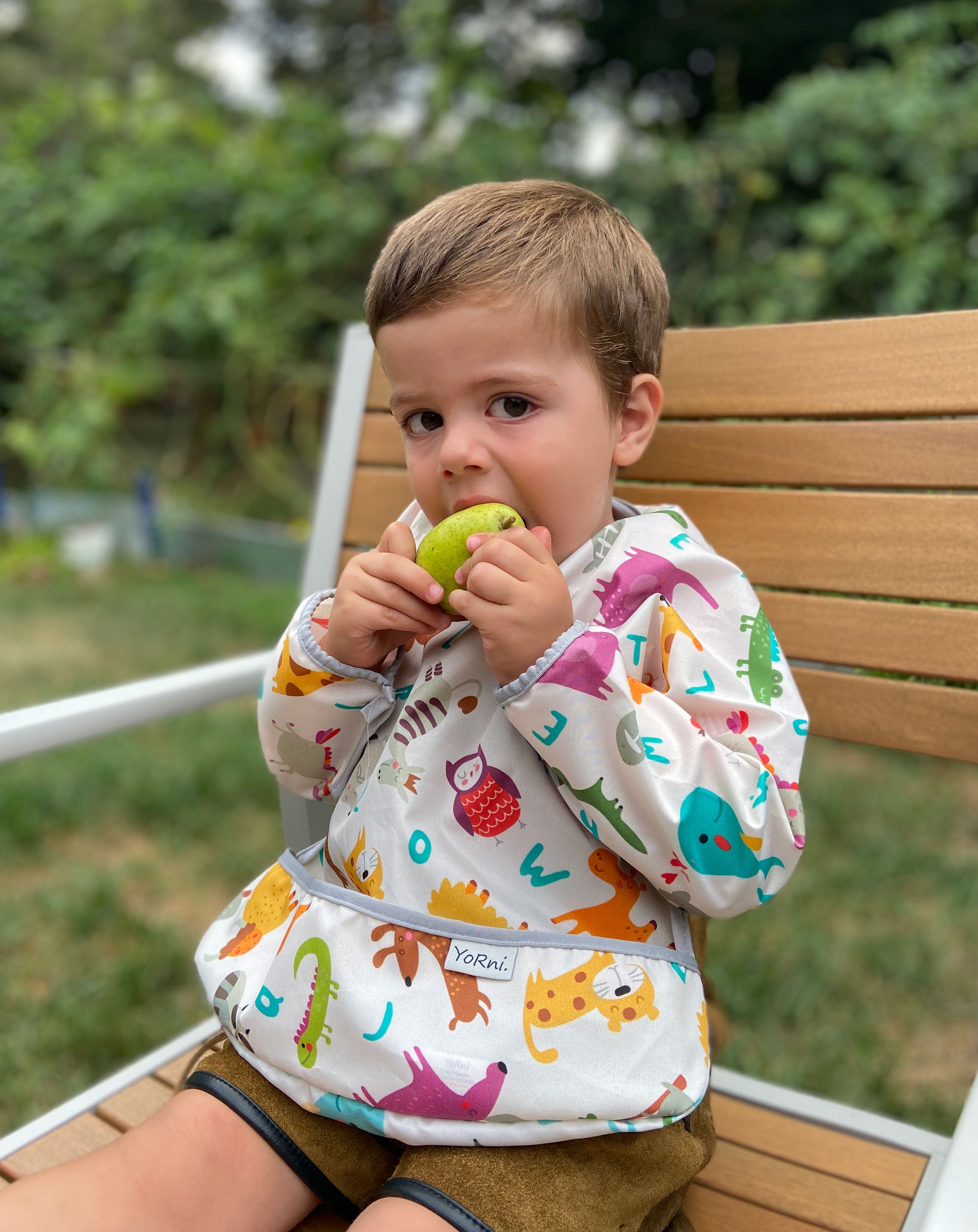 Oyun ve yemek zamanlarında en büyük yardımcınız! Yiyeceklerle oynamayı seven minikler için tasarlanan Yorni uzun kollu önlük, hem sıvı geçirmez hem de makinede yıkanabilir özel teknik kumaşıyla çocuğunuzun kıyafetlerini korur.