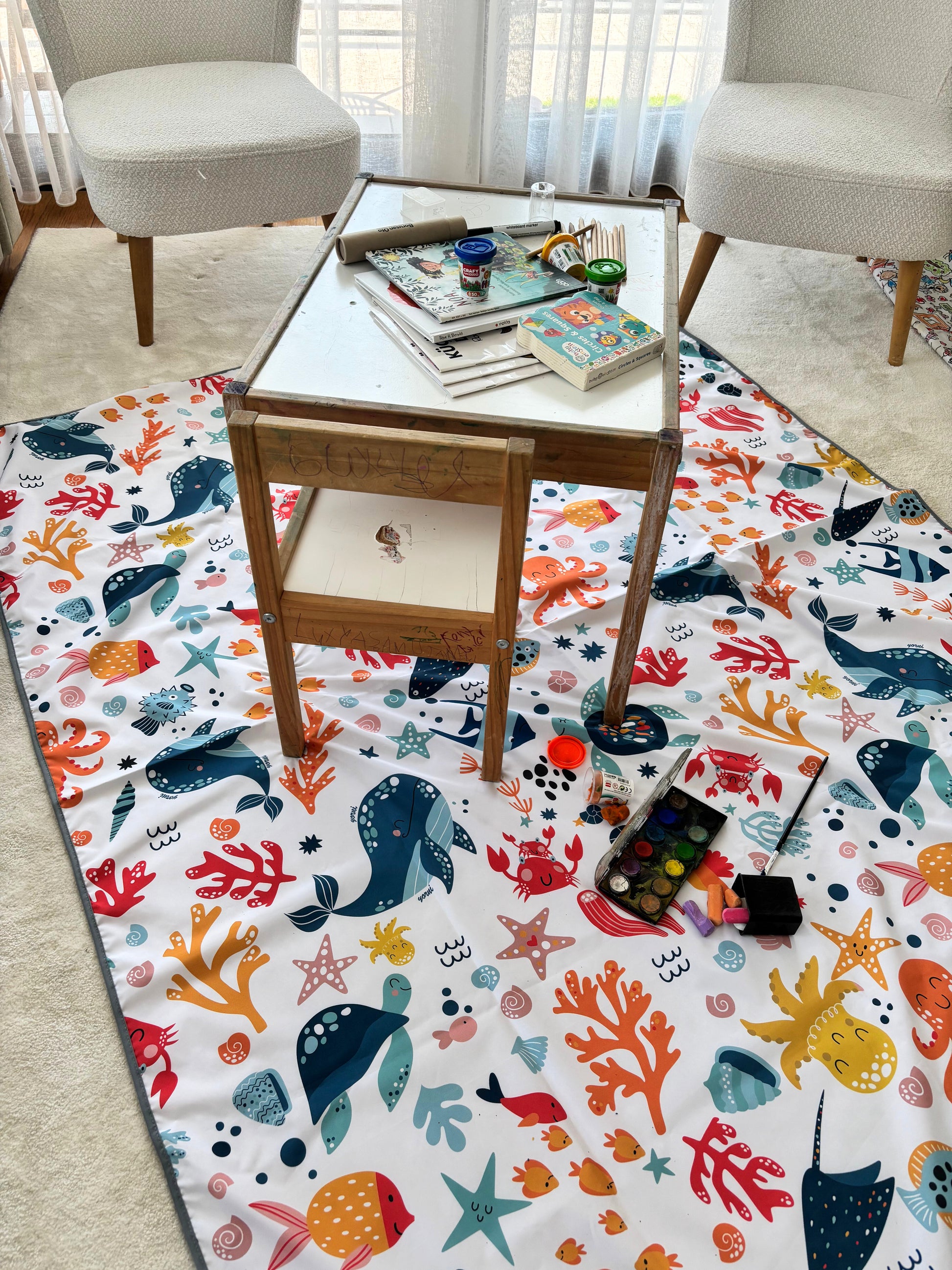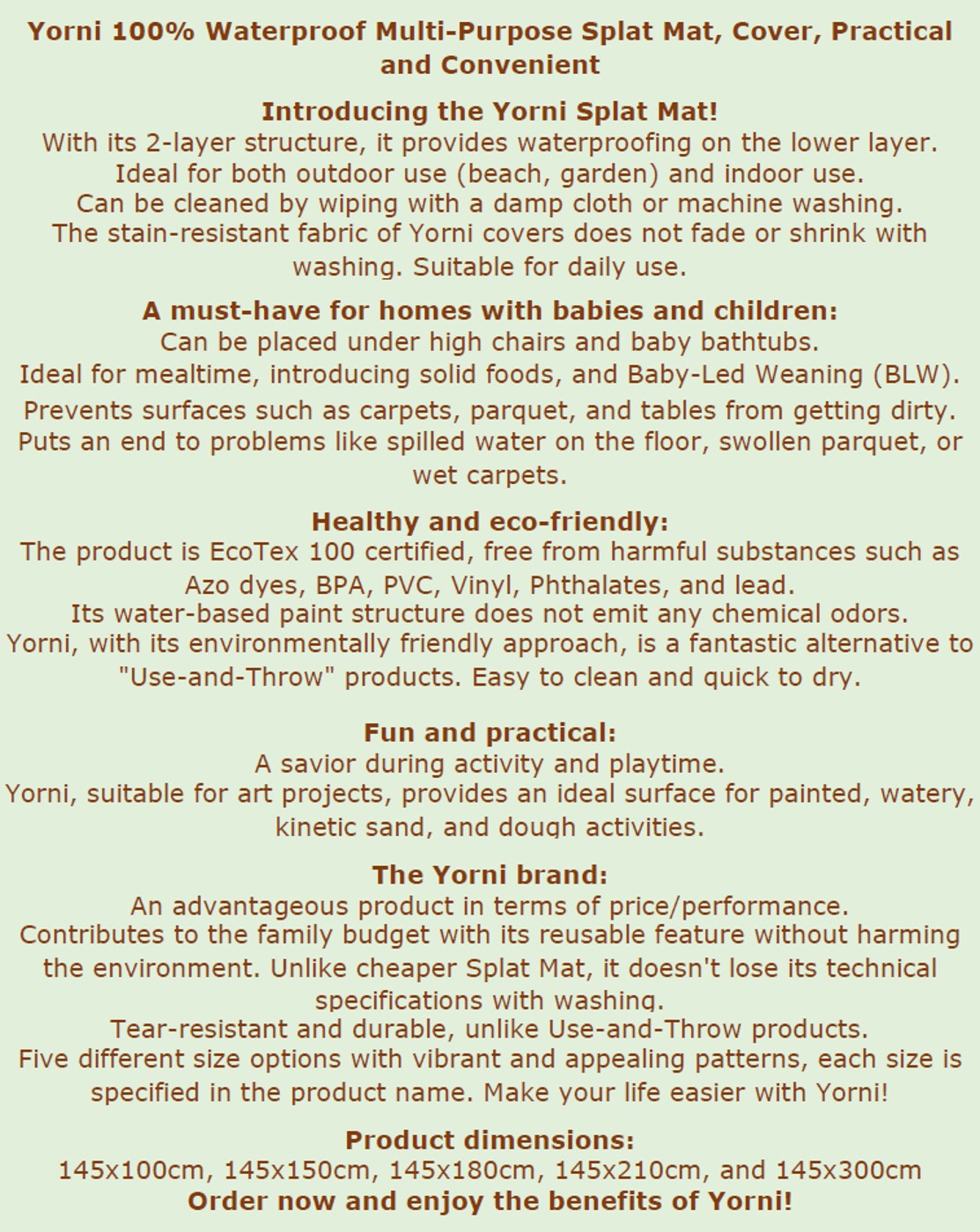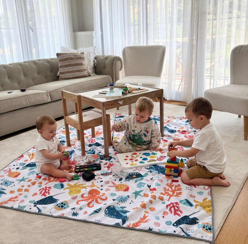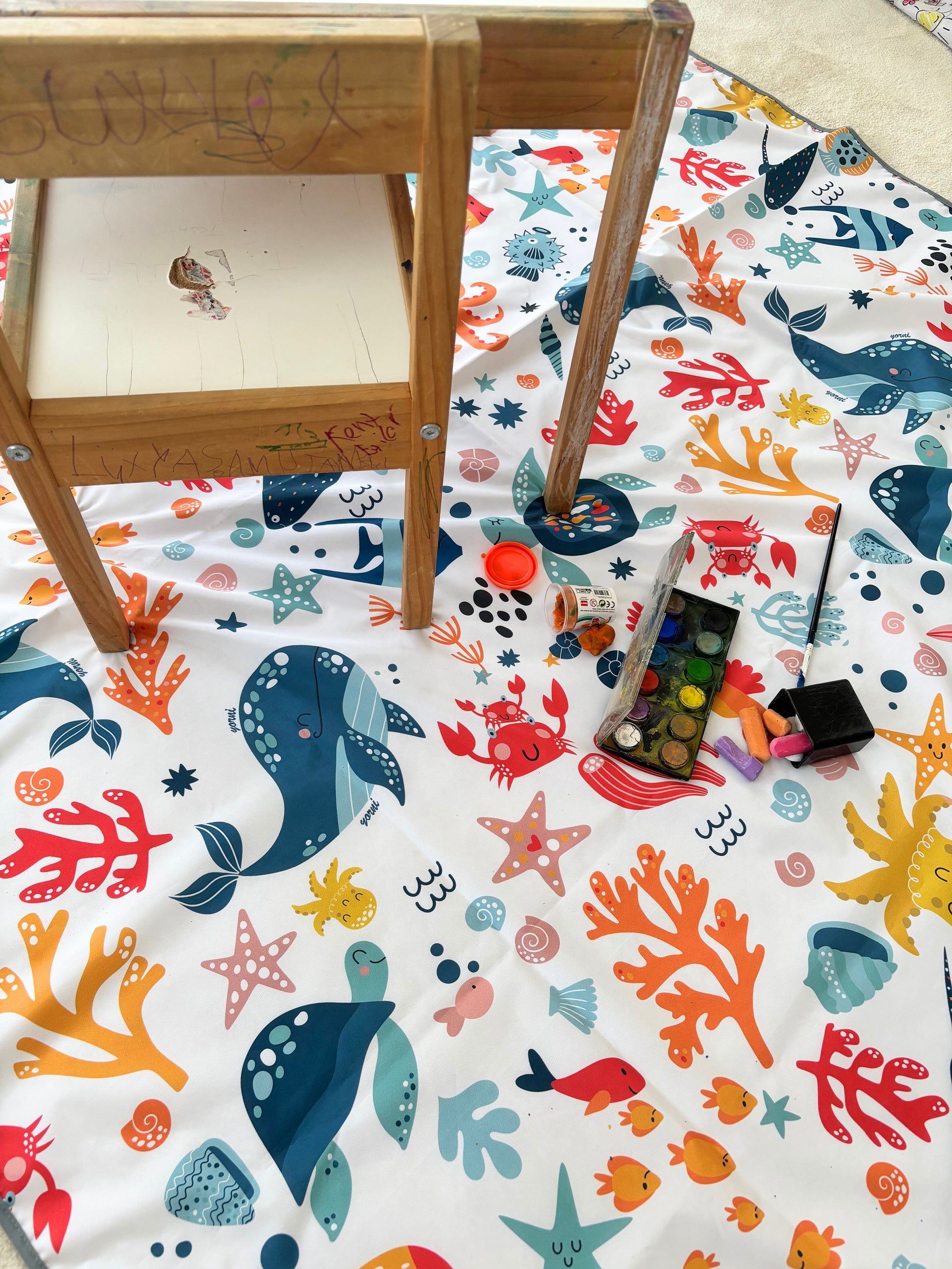 Practical and convenient — meet the Yorni Splat Mat! With its two-layer structure, it provides waterproof protection on the lower layer. Perfect for both outdoor and indoor use.