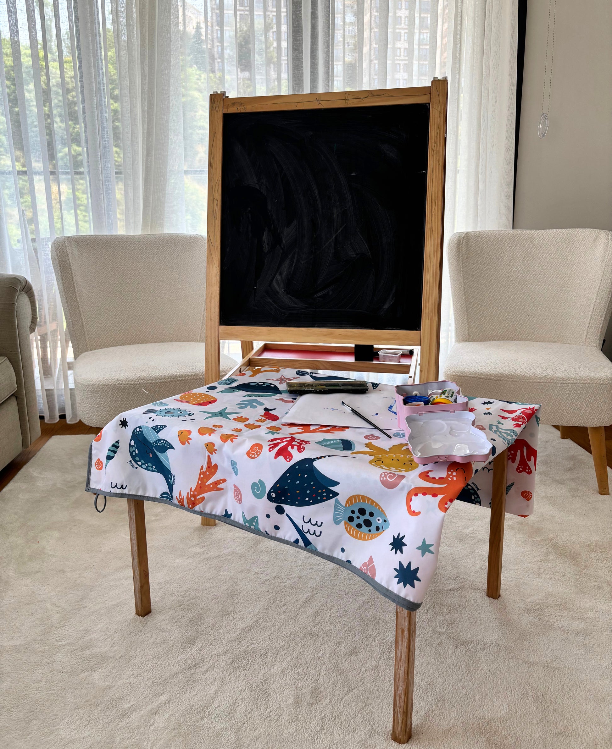 - Etkinlik, sanat, boyama, sulu ve kumlu oyunlar için mükemmeldir.